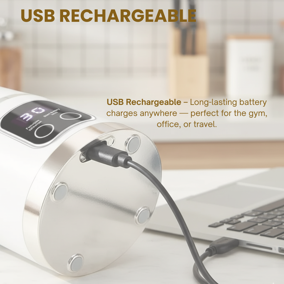 USB-Rechargeable Power – Blend up to 15 cups per charge; simply plug in anywhere — at work, the gym, or on the go.